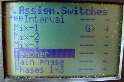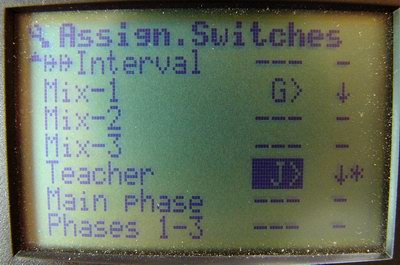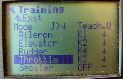 Control Left/Down Centre Right/Up Aileron Servo 6 = -58% Servo 1 = 8% Servo 1 = 80% Rudder Servo 4 = -34% Servo 4 = 5% Servo 4 = 43% Elevator Servo 2 = 38% Servo 2 = 0% Servo 2 = -30% Throttle Servo 3 = -53% N/A Servo 3 = 76% Select Setup->Assignment->Switches then scroll down until the Teacher switch is visible. Ensure the widget that you want to use to select 'student' mode is in the 'teacher' position. Select the 'Teacher' control by pressing the 'Enter' button and then press 'Enter' again to acknowledge that you are changing the template for all models. Then move the widget to the 'student' position. Press 'Enter' to complete the assignment. Now move to the Setup->Training menu and return the 'Teacher widget' to the 'teacher' position. Change the 'Mode' to 'Teach U'. This selects teacher mode with the student radio set to 'universal' timing (ie. 1.5msec neutral pulse width). Move to 'Aileron' and select it. Move the aileron control on the student radio. The 'OFF' will change to the letter 'K' (for channel in German) followed by a number. The number should be the servo channel that the student radio uses for this function. (For Futaba users this is: Aileron = K1, Elevator = K2, Rudder = K4, and Throttle = K3). Press 'Enter' to complete. Now repeat this process for each of the other control functions until you have all of the control functions assigned to the appropriate student radio channel. Return to the Servo->Monitor function and then use a digi-adjuster to move to the numeric display. Check that moving the EVOs controls governs the servo positions. Move the 'Teacher widget' to the 'student' position and then move each of the student radio controls. You should see that the EVOs servo positions are now controlled by the student radio.