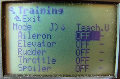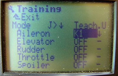 The initial configuration of the teacher/student system will be easier if you select a model on the EVO that has at least the four basic controls (Aileron, Rudder, Elevator and Throttle). The reason for this is that you will need to use the EVO's servo monitor screen to check the calibration of the teacher/student system and this is much easier if the selected EVO model has a servo channel that is driven by each of the control inputs.
