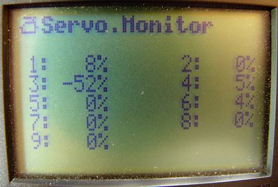 Turn the EVO on with the RF enabled. Select a model that has the four basic control inputs used. Ensure the throttle is at 'idle' (ie. the control stick at minimum). Select the Servo->Monitor function and then use a digi-adjuster to move to the numeric display. Record the displayed values as the 'neutral' position. Move the Aileron to the full left position and record the servo positions. Move the Aileron to the full right position and record the servo positions. Repeat this procedure for the Rudder and Elevator at either extreme and also for the Throttle at maximum. You will now have a table of servo positions that correspond to neutral and the limits of each of the controls. You should see that one of the EVO channels will serve as the primary indicator of the input control position.